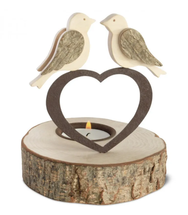 Bougeoir En Bois Avec 2 Oiseaux Face A Face Poses Sur Un Coeur En Metal Oxyde.
