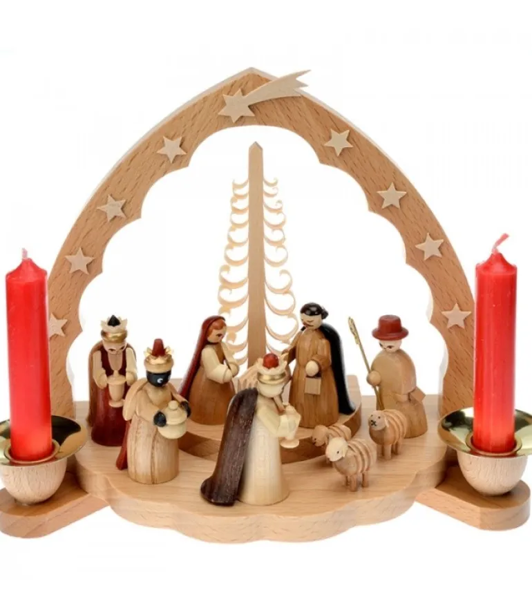 Belle Crèche De Noël De Fabrication Artisanale Avec 2 Bougeoirs Et Nombreux Sujets En Bois.