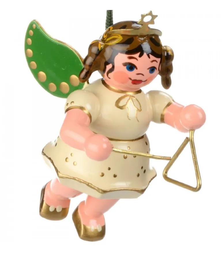 Ange En Bois Peint Qui Joue Du Triangle.