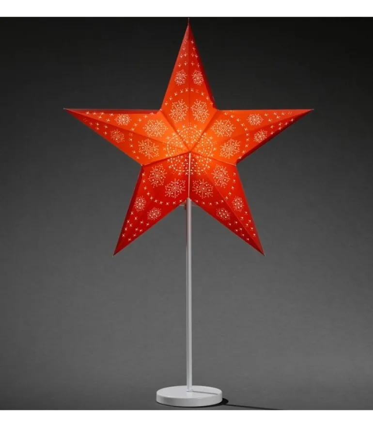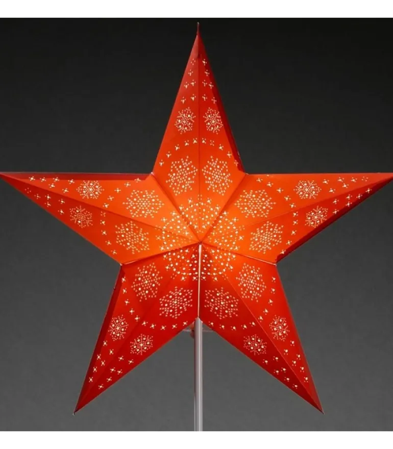 Etoile De Noël Lumineuse 5 Branches En Papier Perfore, Avec Motif Rouge Imprime.
