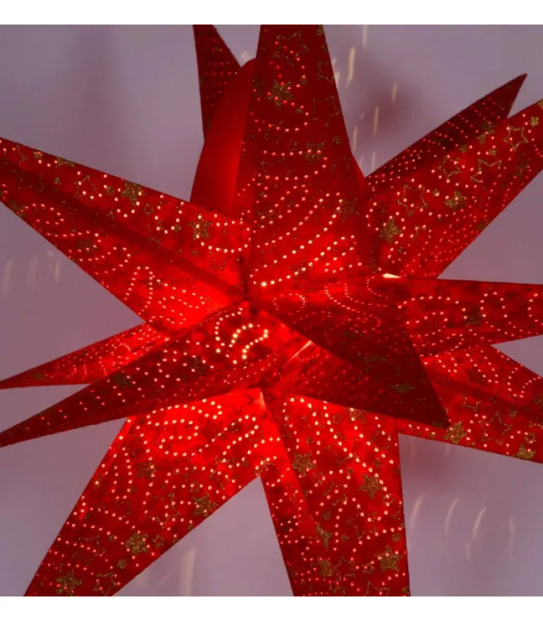 Etoile Lumineuse 3D En Papier A Suspendre, Couleur Rouge, Avec Motif Etoiles Dorees.