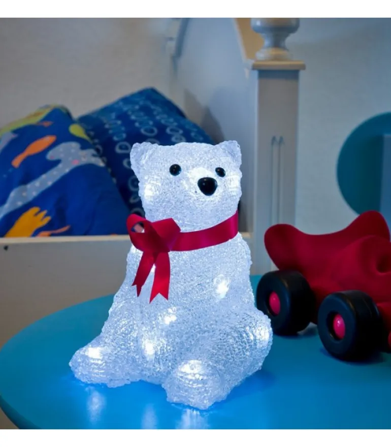Petit Ours Lumineux A Led En Acrylique Avec Ruban Rouge, 16 Diodes Blanc Froid.