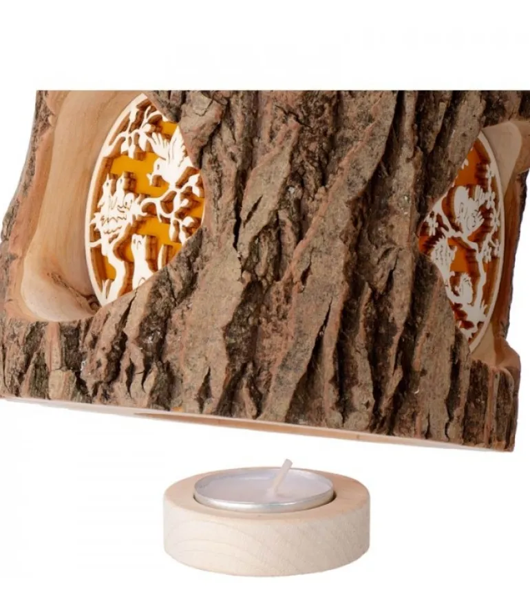 Photophore Dans Un Rondin De Bois Avec Trois Motifs Translucides : Ecureuils Et Chouettes, Chat Et Oiseaux Et Oiseau Et Herisson.