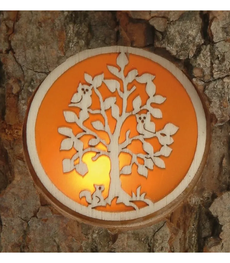 Photophore Dans Un Rondin De Bois Avec Trois Motifs Translucides : Oiseaux Sur Une Branche, Hiboux Dans Un Arbre Et Animaux Dans La Foret.