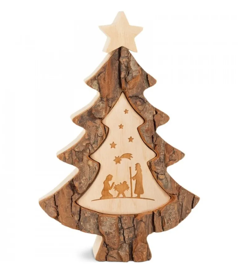 Sapin De Noël En Bois Découpe Dans De L’Ecorce Avec Etoile Sur Le Dessus.