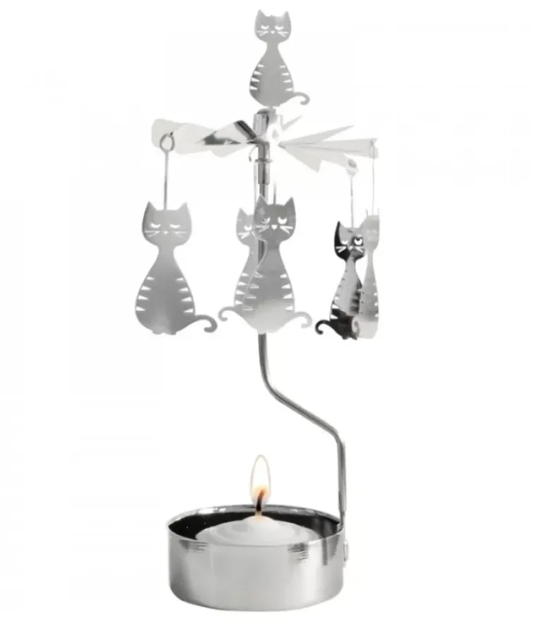 Bougeoir Carrousel Avec Six Chatons Assis En Metal Argente.