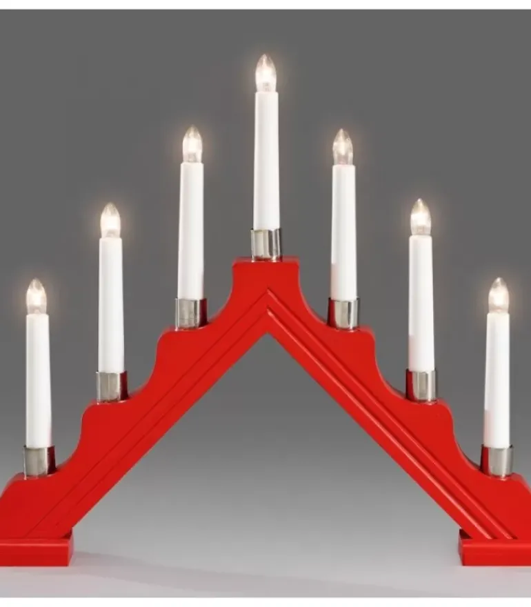 Chandelier De Noël Pyramide En Bois A Bougie Electrique Avec Bague Metal, Couleur Rouge.