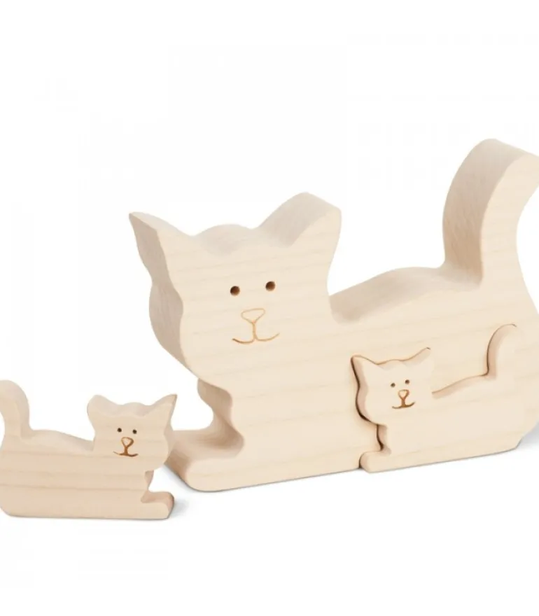 Chat En Bois Avec Deux Chatons, 8,5 Cm