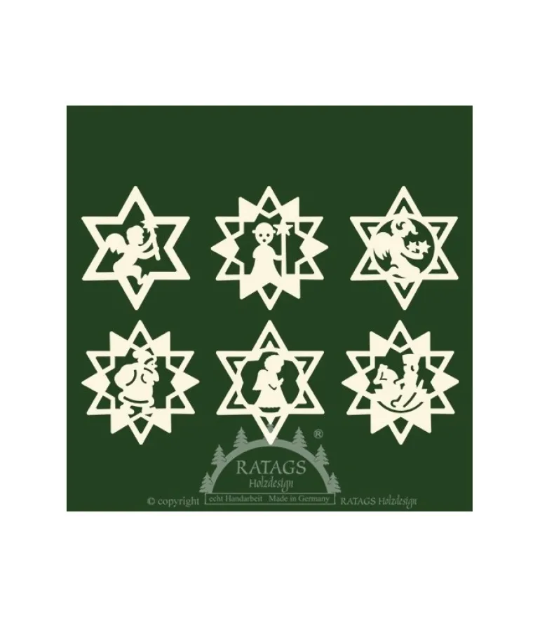 Ce Kit N° 9 Comprend 6 Etoiles En Bois Avec Differents Motifs : Ange, Père Noël, Cheval De Bois …