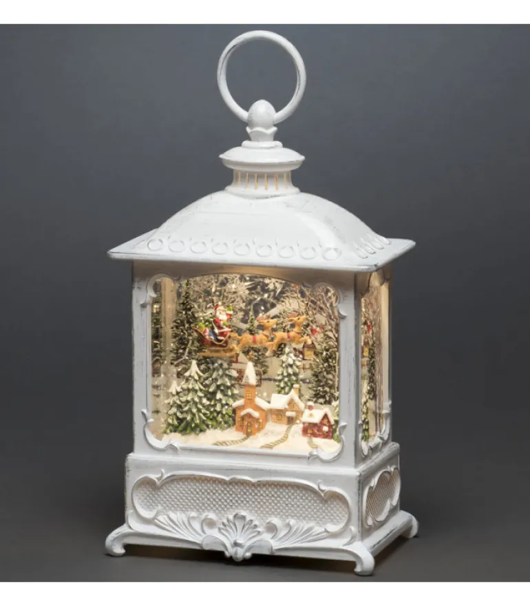 Petite Lanterne De Noël A Eau Avec Père Noël Volant Au-Dessus D’Un Village, Couleur Blanc Antique.