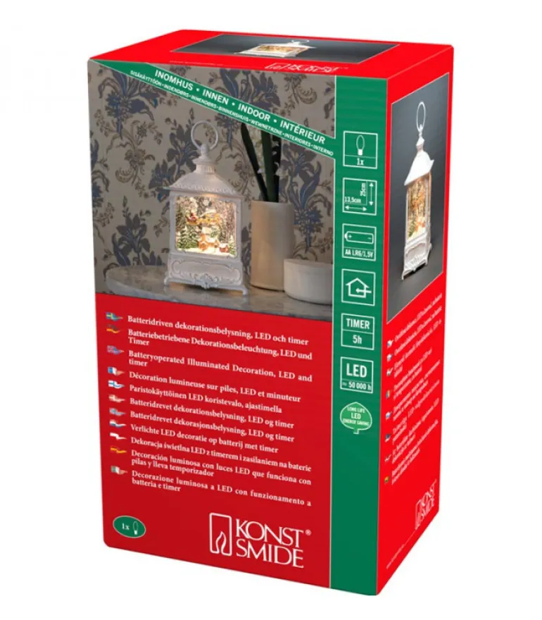 Une Petite Pompe A L’Interieur Brasse L’Eau Et Fait Tournoyer Les Paillettes De Neige. Un Eclairage Led Eclaire La Scene D’Une Douce Lumiere.