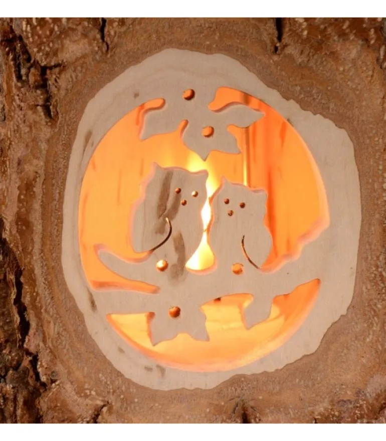 Lanterne Photophore Avec Motif D’Un Couple D’Hiboux En Bois Cisele Sur Chaque Cote. Equipee D’Une Anse Metal.