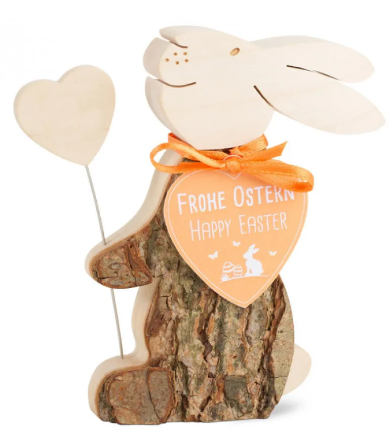 Lapin En Bois Assis En Ecorce Et Bois Naturel Avec Un Coeur Entre Les Pattes.