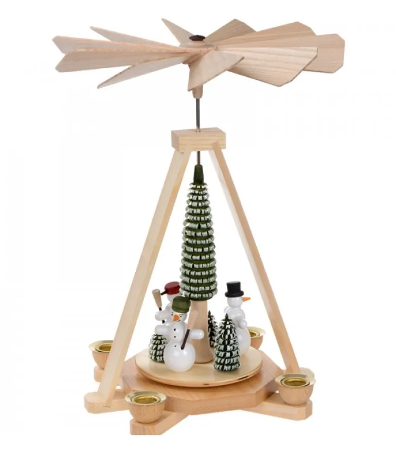 Pyramide A Bougie Avec Bonhommes De Neige Autour D’Un Sapin.
