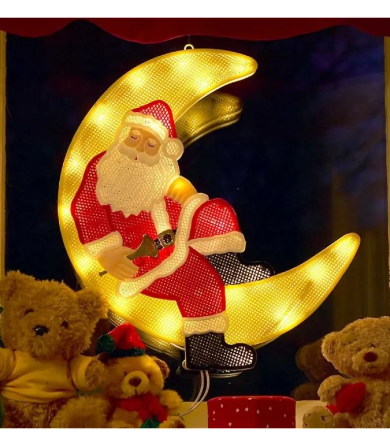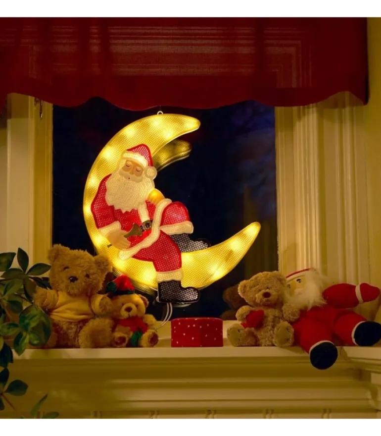Image De Fenetre A Led, Père Noël Lumineux Assis Sur La Lune Qui Dort.