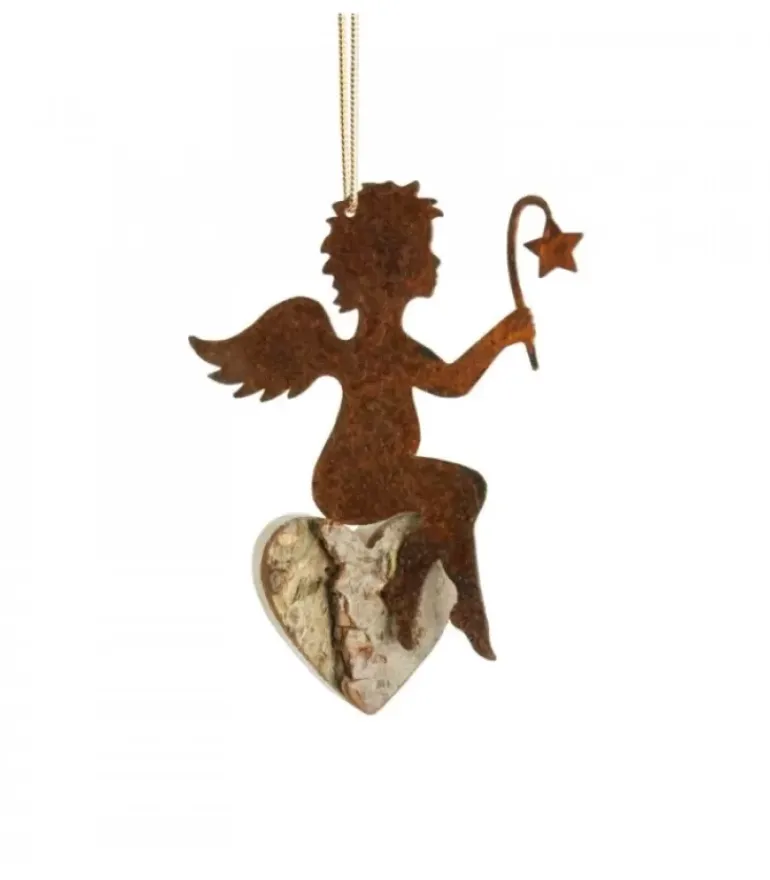 Petit Ange A Suspendre Au Sapin De Noël Assis Sur Un Coeur En Ecorce De Bois Et Tenant Une Etoile.