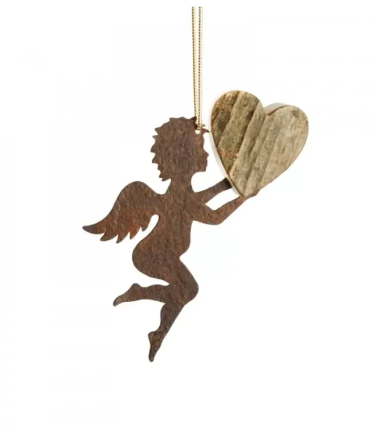 Petit Ange A Suspendre Au Sapin De Noël Tenant Un Coeur En Ecorce De Bois.