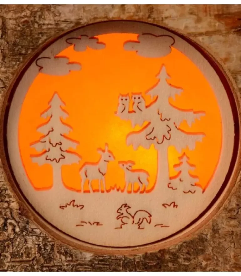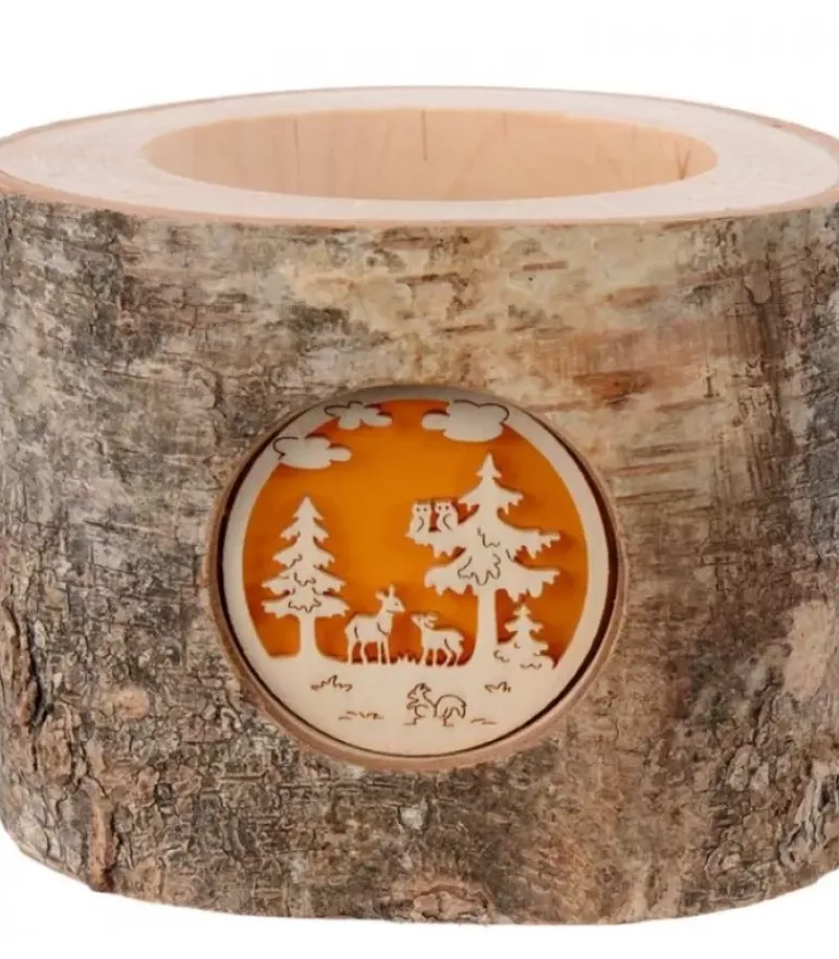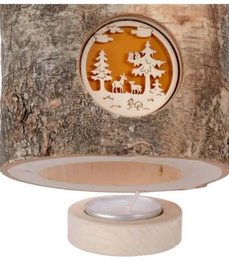Photophore En Ecorce Dans Un Rondin De Bois, De Forme Ronde Avec Un Motif Translucide D’Une Scene De Foret Avec Biche Et Faon.