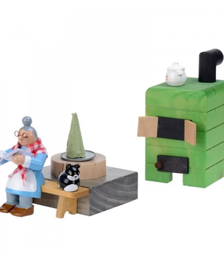 Poele En Faience Avec Grand-Mere Lisant Le Journal Et Chat.