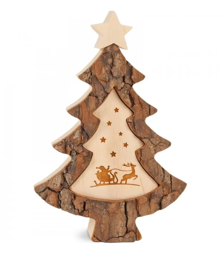 Sapin De Noël En Bois Découpe Dans De L’Ecorce Avec Etoile Sur Le Dessus.